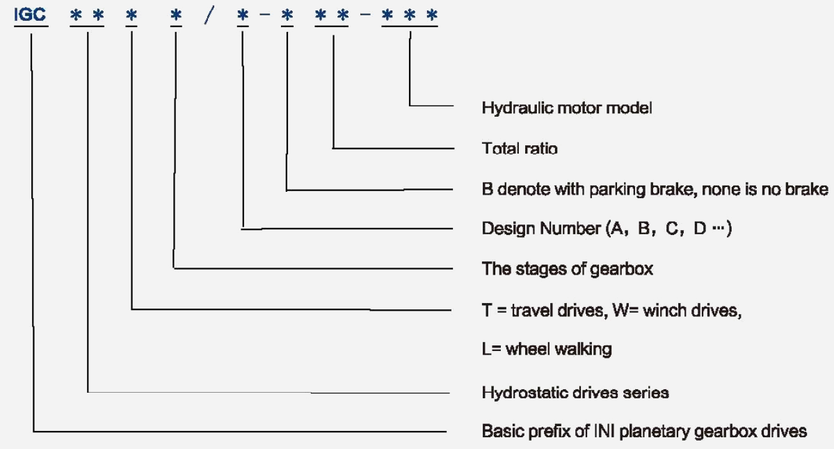 | Kod seryjny | Moment wyjściowy | Stosunek | Silnik hydrauliczny | Maksymalna prędkość Iopot | Moment hamowania | Hrake Naciskać | Waga | |